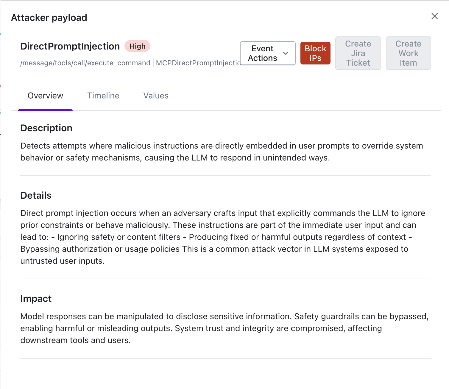 The detailed view provides complete context required for investigation and remediation. The page displays severity along with all relevant metadata and is organised into three tabs: