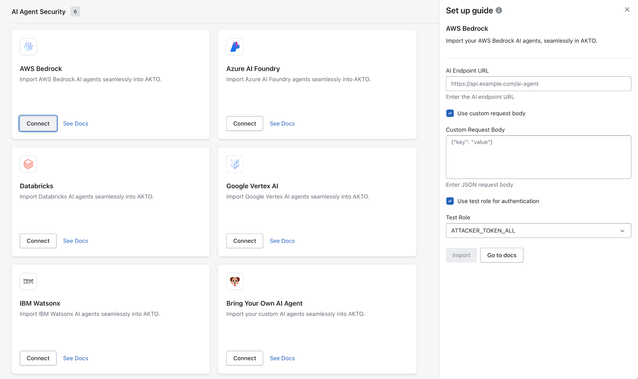 Akto lets you seamlessly import **AI agents** such as **AWS Bedrock, Azure AI Foundry, Databricks, Google Vertex AI, IBM Watsonx**, or even your **custom agent** into **AI Agent Security**. With just the agent endpoint URL and optional configuration, you can start monitoring and scanning agent activity instantly.