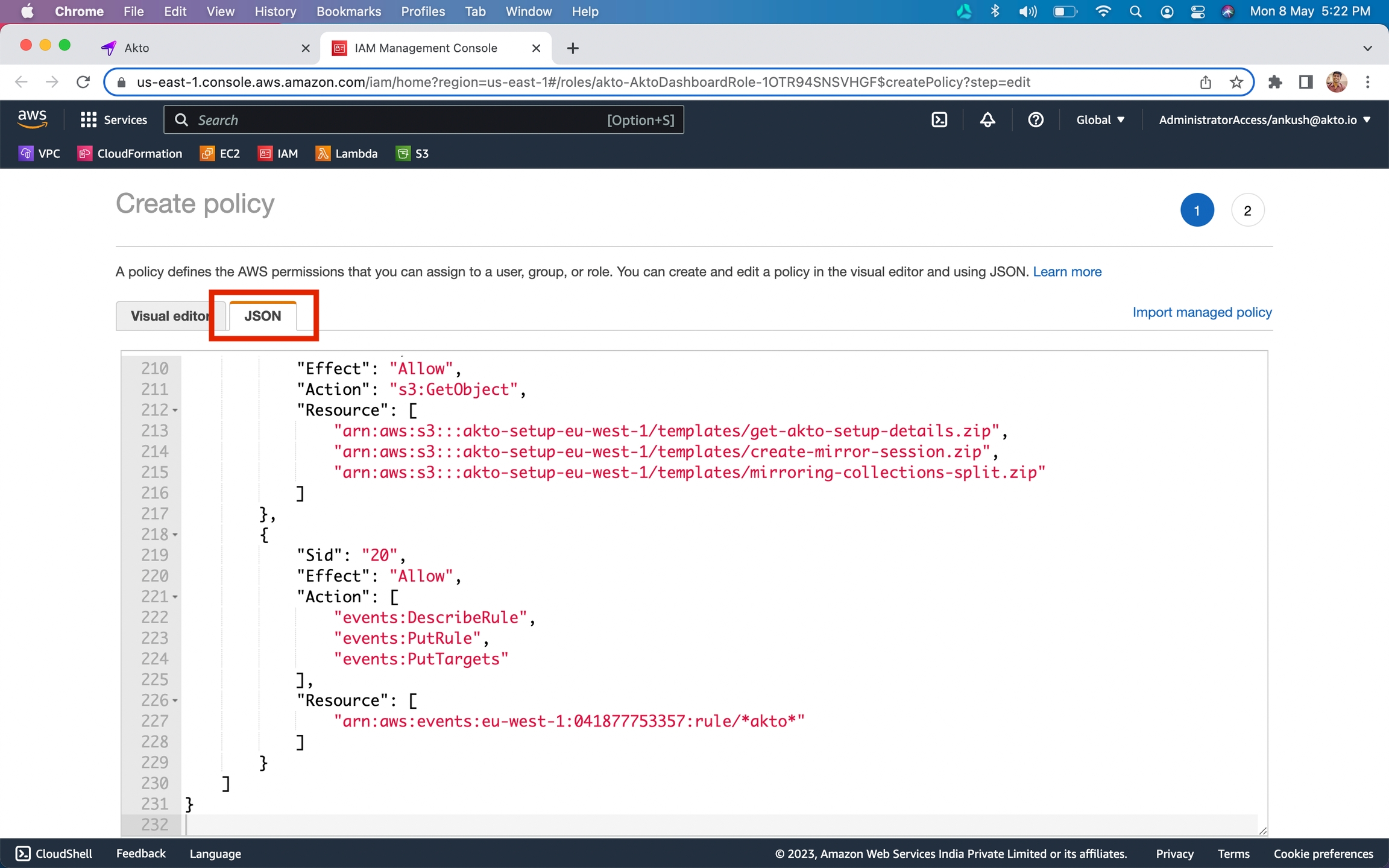 3. Copy the policy json and click on the Akto Dashboard role link.