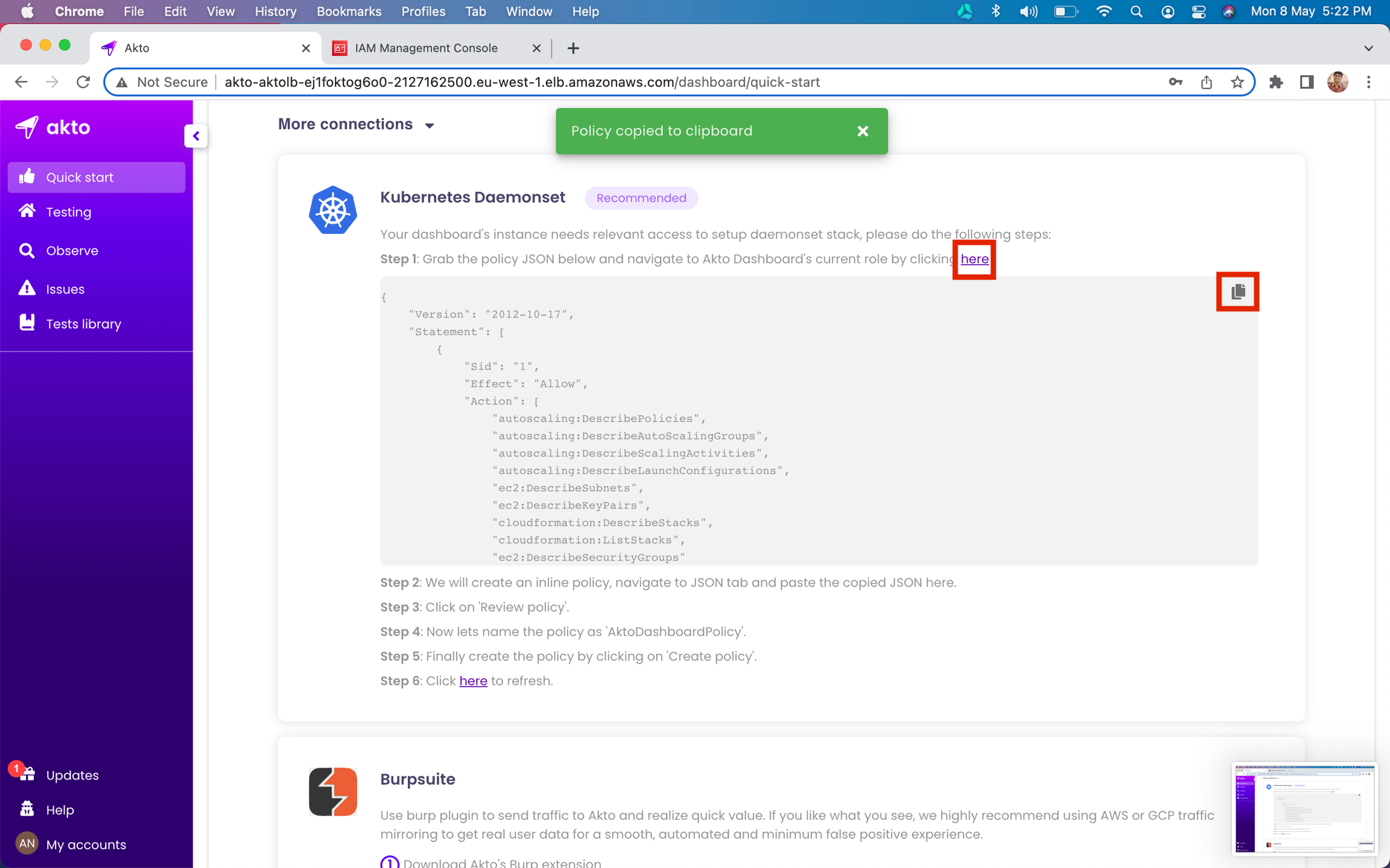 1. Copy the policy json and click on the Akto Dashboard role link.