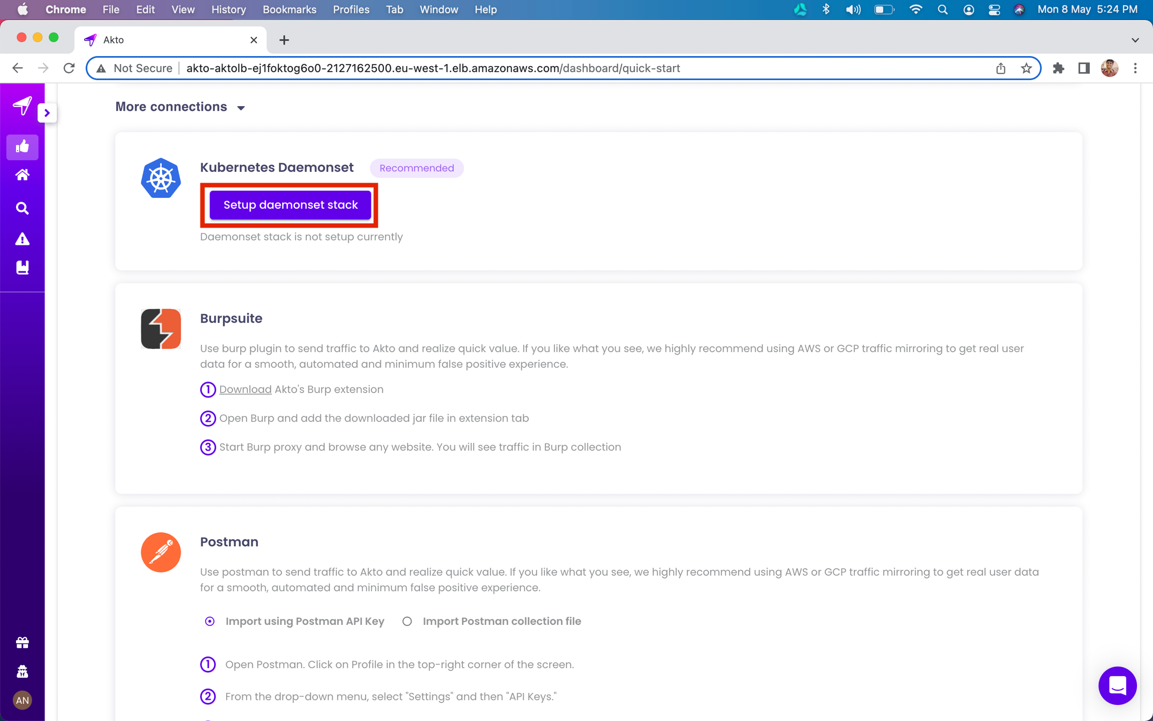 1. Go to Quick Start on your Akto dashboard and expand the Connect traffic data section.