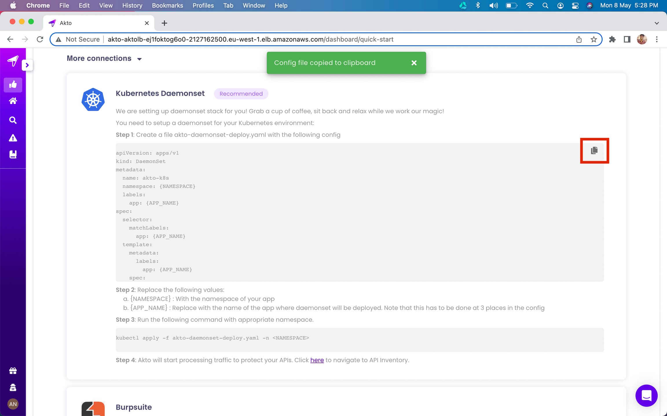 5. Call kubectl apply -f akto-daemonset-config.yaml -n <NAMESPACE> on your kubectl terminal