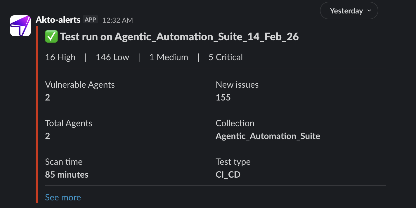 Slack integration with Akto enables automatic notifications in your Slack channels when new Agentic components are discovered and security issues are detected. This integration ensures your team stays informed about Agentic component changes and potential security concerns in real-time within your Slack workspace.
